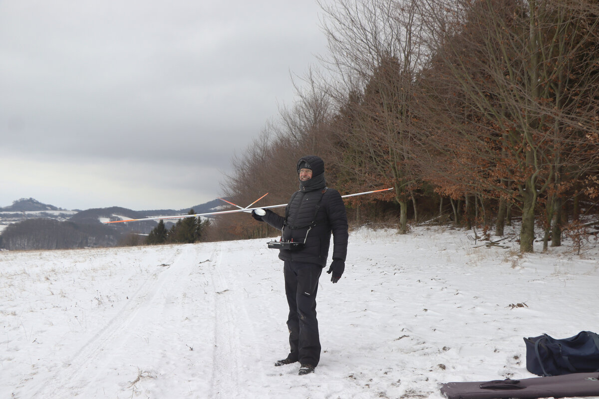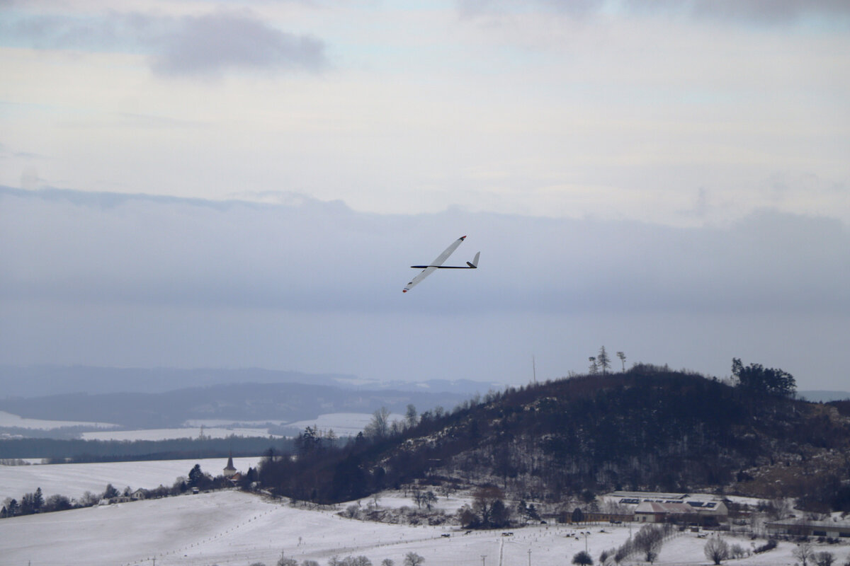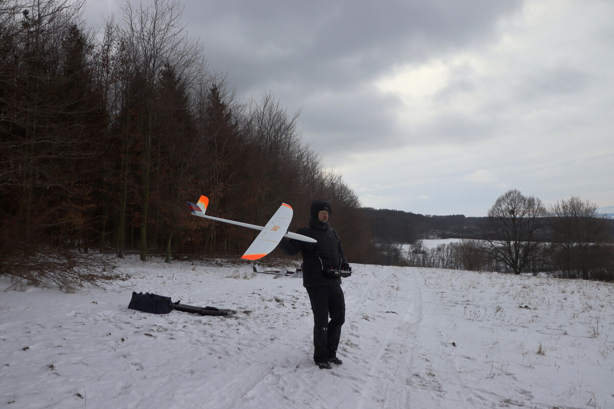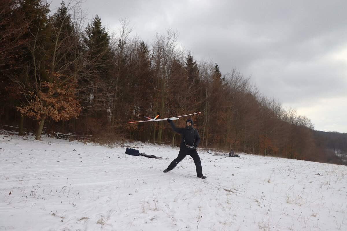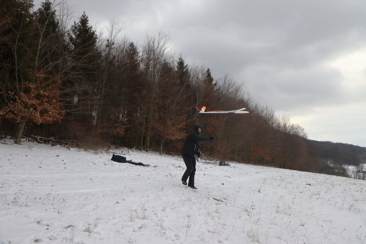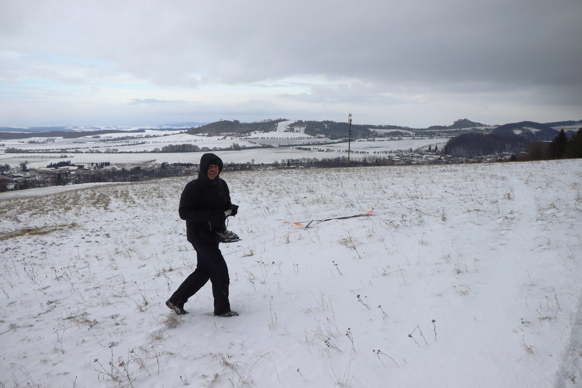 Příjezdová cesta byla sjízdná pohodlně, povětšinou holá až po šutr…. až po „křižovatku“ u plotka u lesní školky. Odbočka směrem ke střelnici byla víc zafoukaná….neměl sem úplně chuť tam fabku schovat, tak sem došel pěšky…. je to po rovince a procházka neuškodila. Byl sem ve vzduchu sotva pár minut, než dorazil Luboš se Stingem. Oba máme do tohoto počasí trochu nevhodnou kamufláž, ale sníh nebyl tak hluboký. Krtiny to sice taky neschovalo, ale netrefili sme je. 🙂 Svah nosil použitelně a lesík za zády ještě lépe, takže i na tlačené přemety byla rezerva.