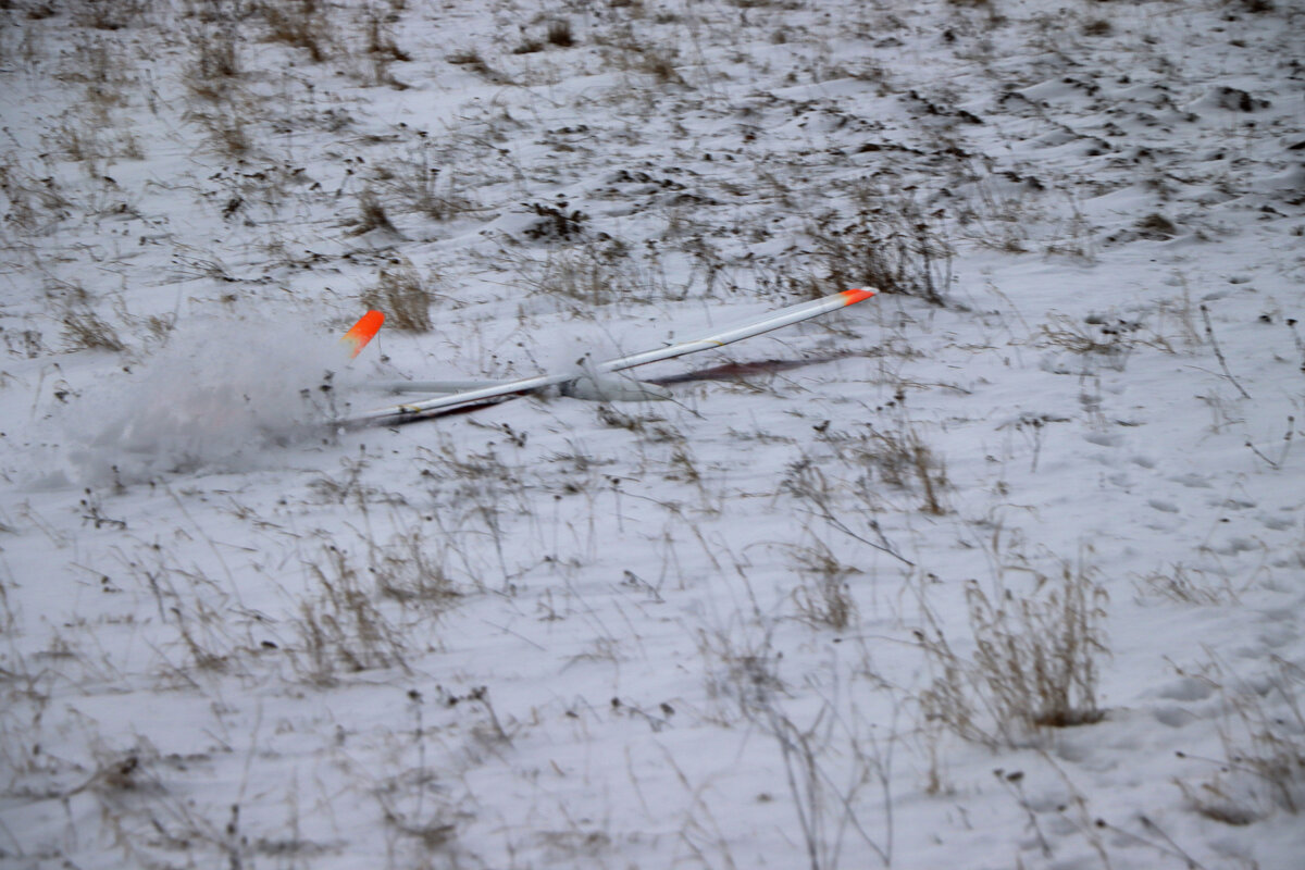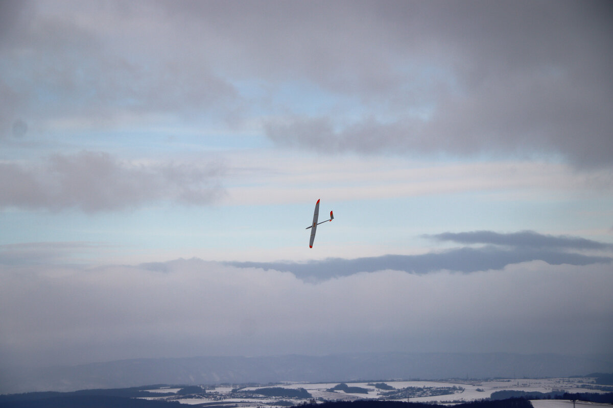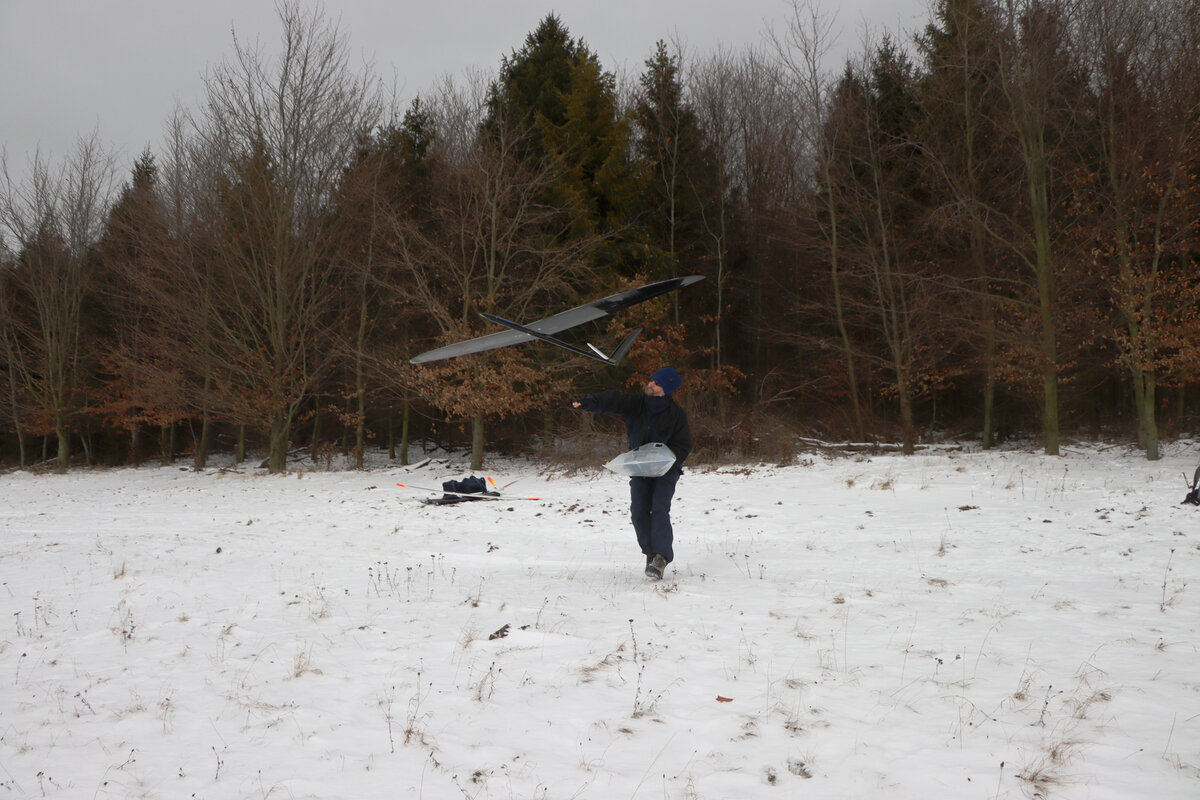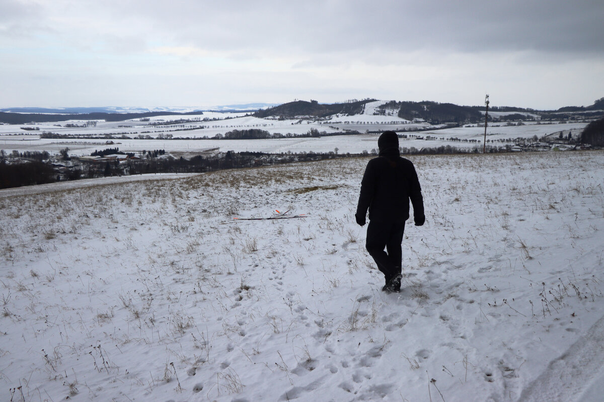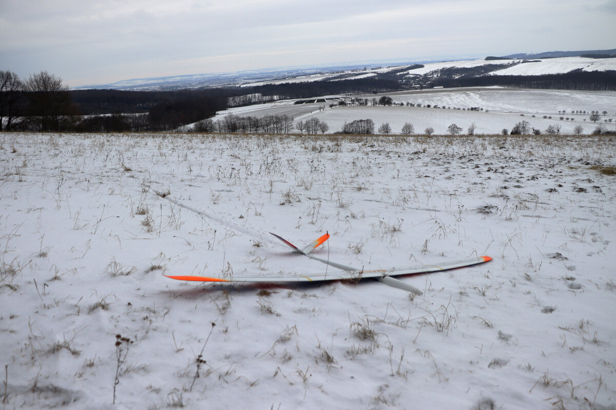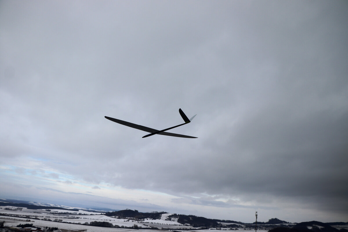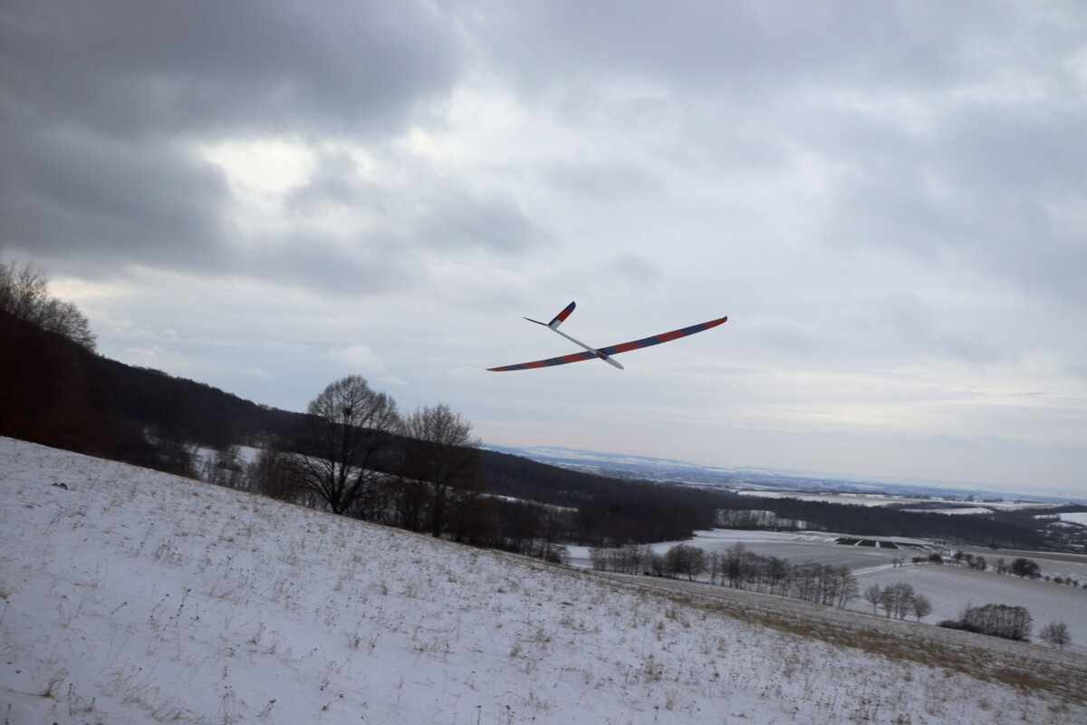 Příjezdová cesta byla sjízdná pohodlně, povětšinou holá až po šutr…. až po „křižovatku“ u plotka u lesní školky. Odbočka směrem ke střelnici byla víc zafoukaná….neměl sem úplně chuť tam fabku schovat, tak sem došel pěšky…. je to po rovince a procházka neuškodila. Byl sem ve vzduchu sotva pár minut, než dorazil Luboš se Stingem. Oba máme do tohoto počasí trochu nevhodnou kamufláž, ale sníh nebyl tak hluboký. Krtiny to sice taky neschovalo, ale netrefili sme je. 🙂 Svah nosil použitelně a lesík za zády ještě lépe, takže i na tlačené přemety byla rezerva.